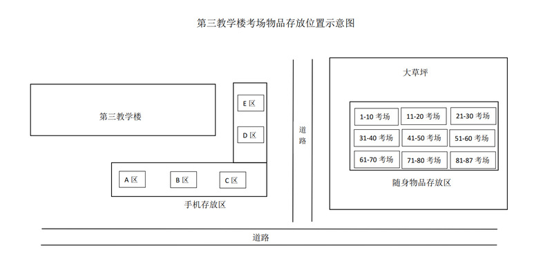 1、手机存放:拟沿着第三教学正门到西北面摆放按考生人数1:1设置的手机存放柜,供考生自己存放手机,如图A区至E区。