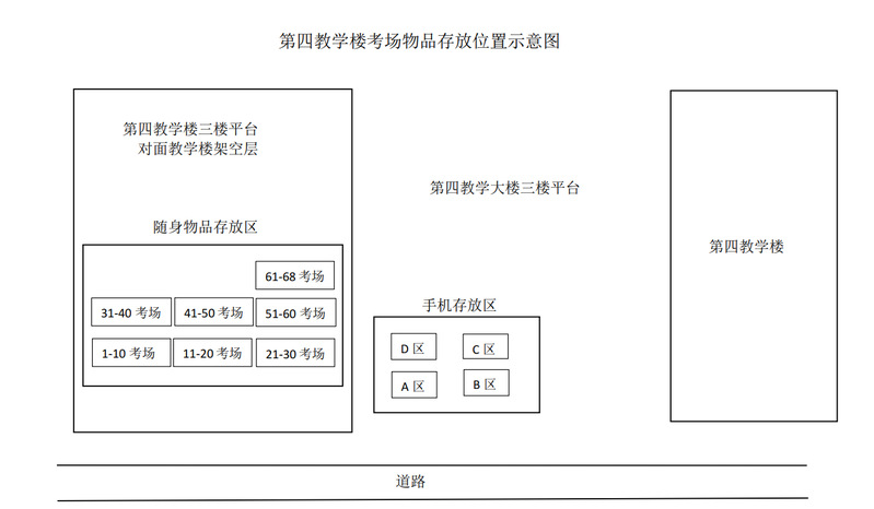1、手机存放:拟在教四实验楼下架空层摆放按考生人数1:1设置的手机存放柜,供考生自己存放手机如图A区至D区。